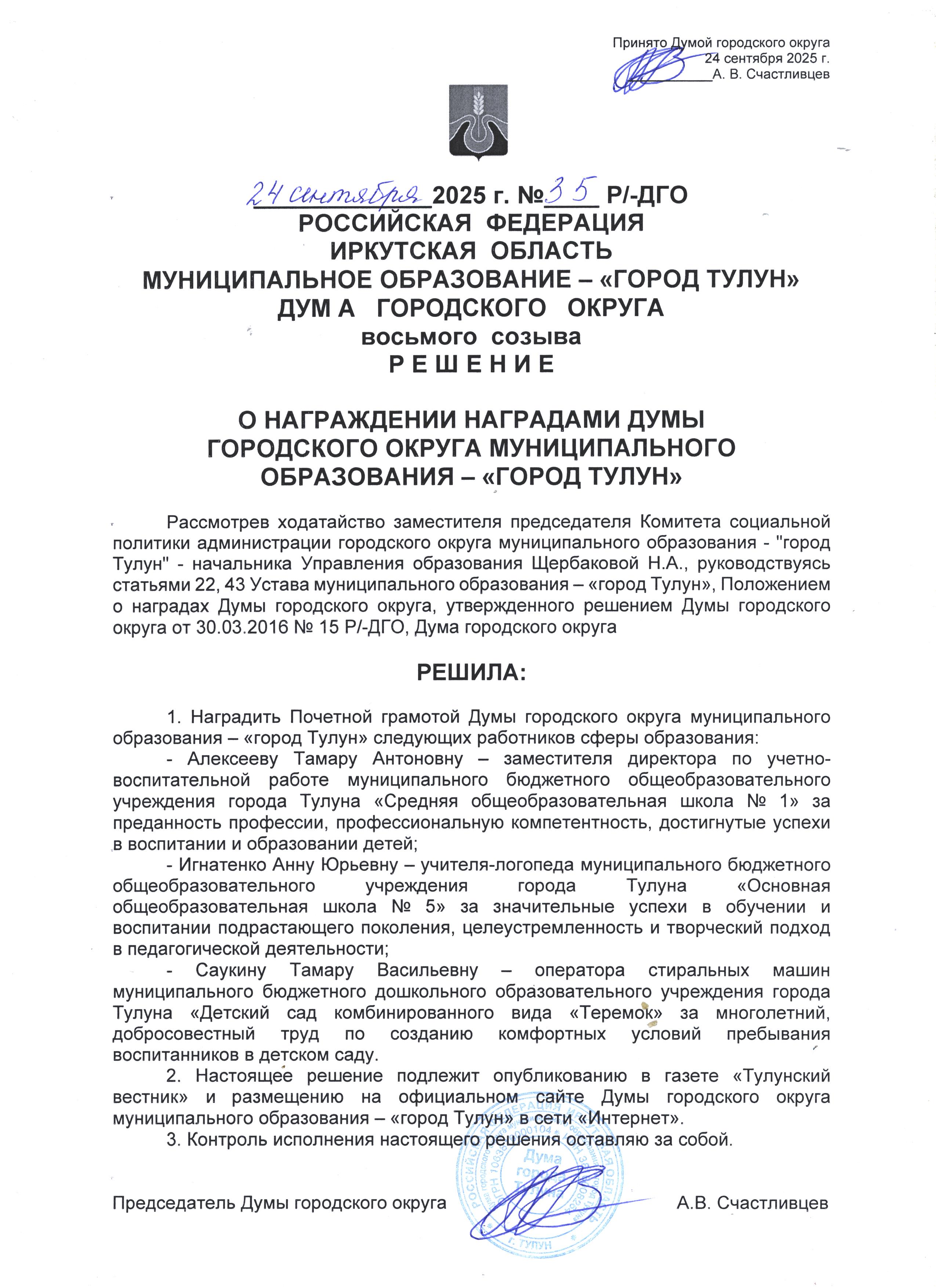 Решение Думы ГО от 24.09.2025 №35Р/-ДГО "О награждении наградами Думы городского округа муниципального образования – "город Тулун"